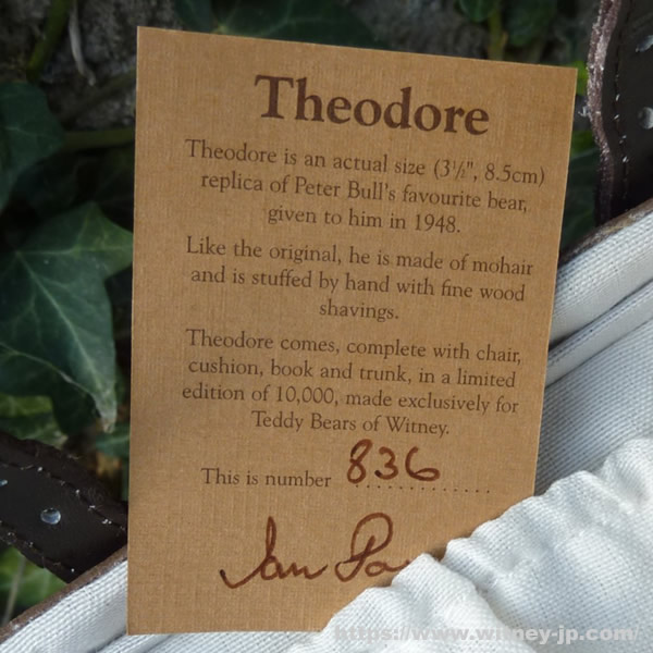 テディベアの父として知られるイギリスの俳優、故ピーター・ブルが肌身離さず可愛がったという小さなベア「セオドア」のレプリカです。