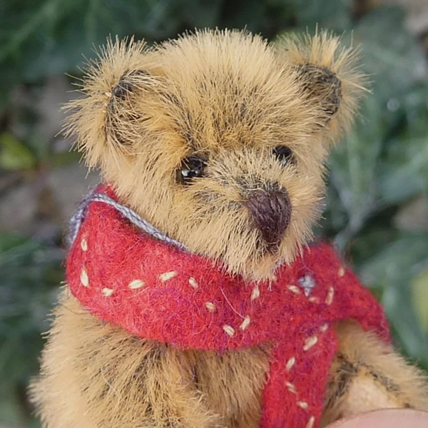 首には赤いフェルトのスカーフを巻いた、あたたかみのある小さなベアです。