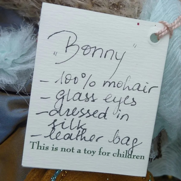 黒いグラスアイ。鼻にはワックス加工された糸を使用。ハンドペイントによる表情のディテール。手足の裏は麻。