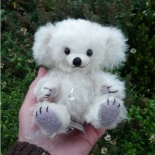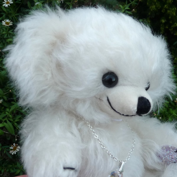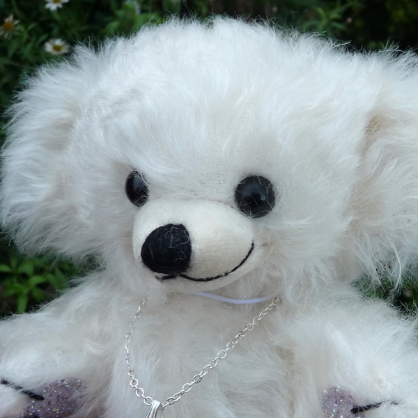 優しくウエーブした、アイボリーカラーのモヘア製。フェルトの鼻づら。黒いプラスチックの目。