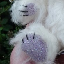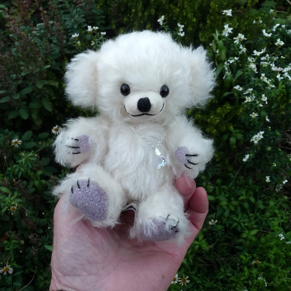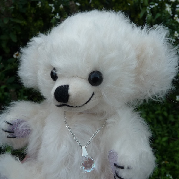 優しくウエーブした、アイボリーカラーのモヘア製。フェルトの鼻づら。黒いプラスチックの目。