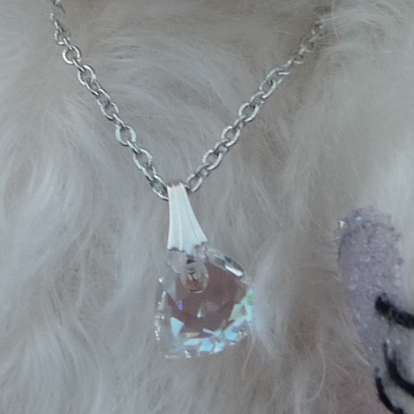 シルバープレートのチェーンに、フェイククリスタルのペンダントをつけています。