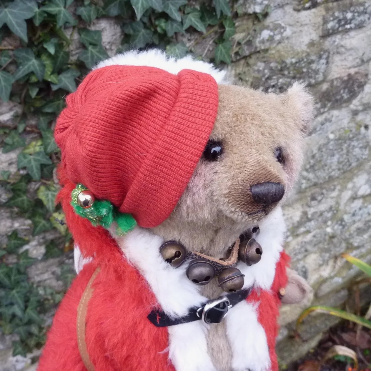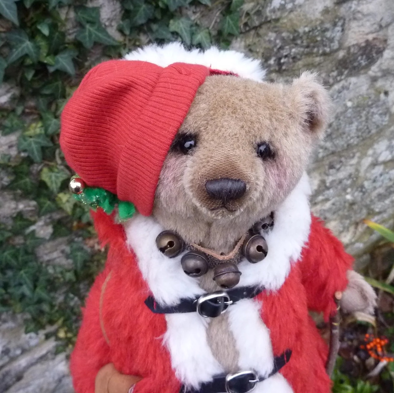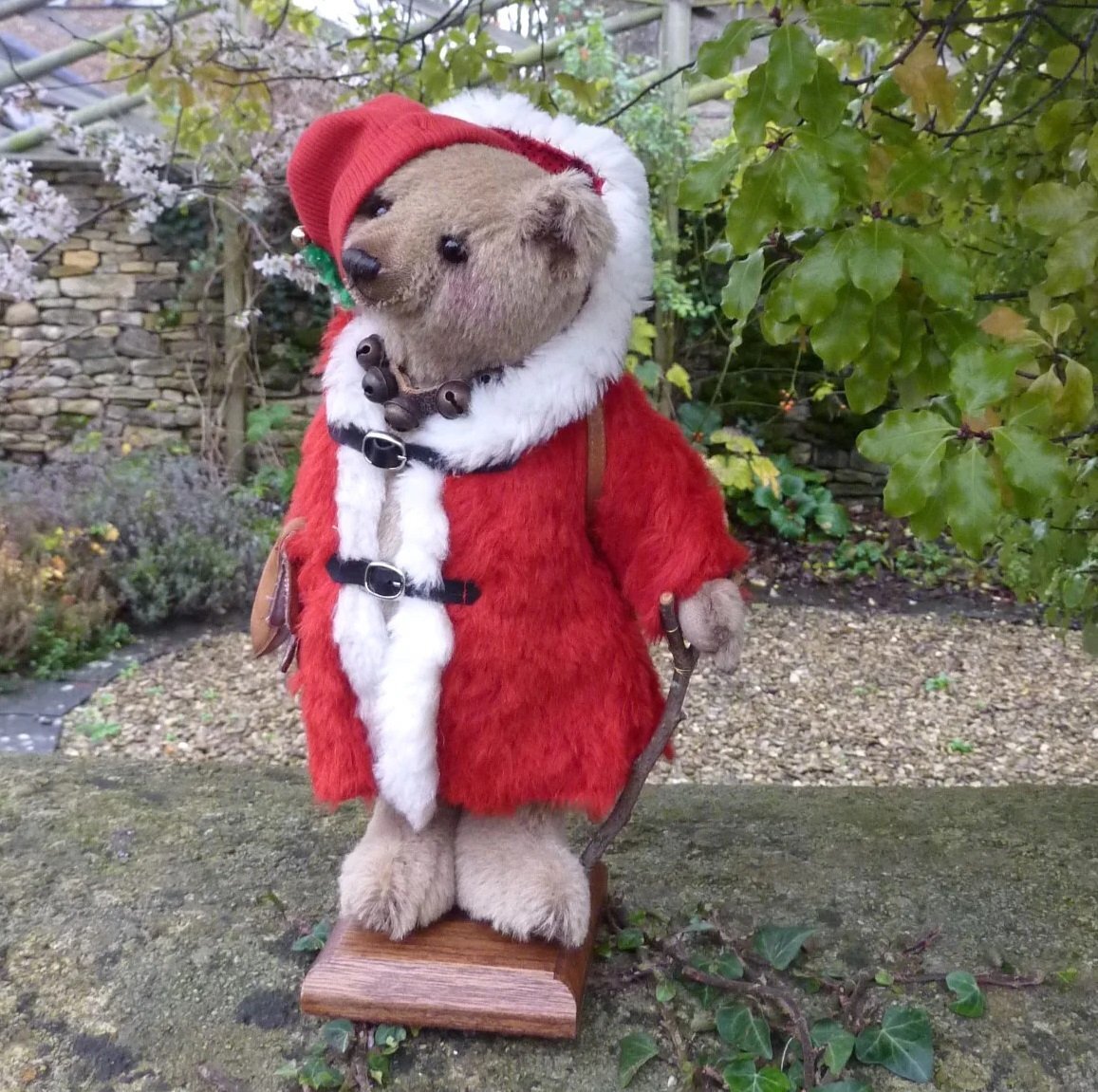 キャメル色のモヘアで丁寧に制作された、味わい深いサンタベア、ファーザーー・クリスマスです。