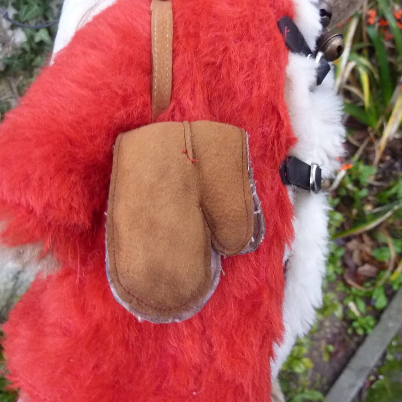 ポケットにはスエードのミトンを忍ばせ、背中にはリネンの袋、手には杖を持っています。