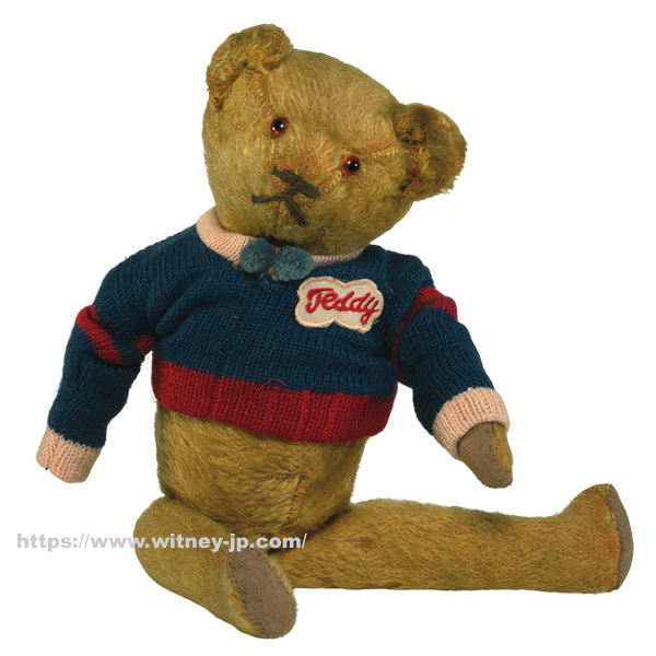 ※この商品はウィットニーに居る珍しいアンティークベアのレプリカ「オールドウィットニーフェイバリッツ」シリーズの仲間です。このシリーズのベアたちは、お顔やボディ、手足の裏が汚れたようにペイントされていたり、ジョイントが緩かったり、モヘアの毛が抜かれていたりと、本物のアンティークベアに見えるように仕上げられています。予めご了承ください。