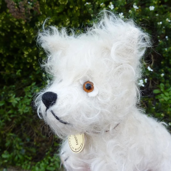 2022年4月にドイツで開催された「テディベアトータル」で古いベアを探していたイアンさんは、ドイツのディラーのスタンドを離れようとしたときに、何気なく棚を見上げそこに1930年代のふわふわとしたとても可愛い白い犬を見つけました。その犬がボビーのオリジナルです。そして、ウィットニーのオールドウィットニーフェイバリッツの仲間「ボビー」が誕生したのでした。