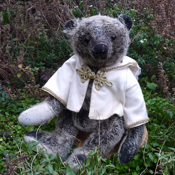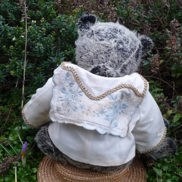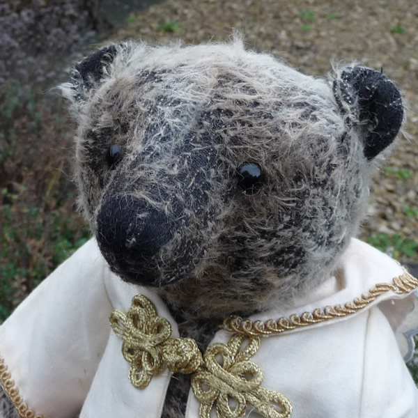 非常に毛量の少ない、個性的なグレーカラーのモヘアを使用。ダークグレーの下地が透けて見える、独特の風合いを持つ中くらいサイズのテディベアです。