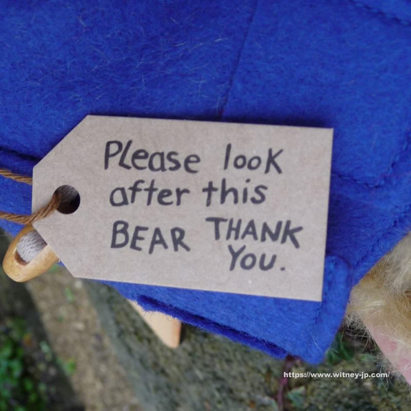 ‘Please look after this bear. Thank you.(このくまをよろしくお願いします。)’と書かれたタグ付きです。