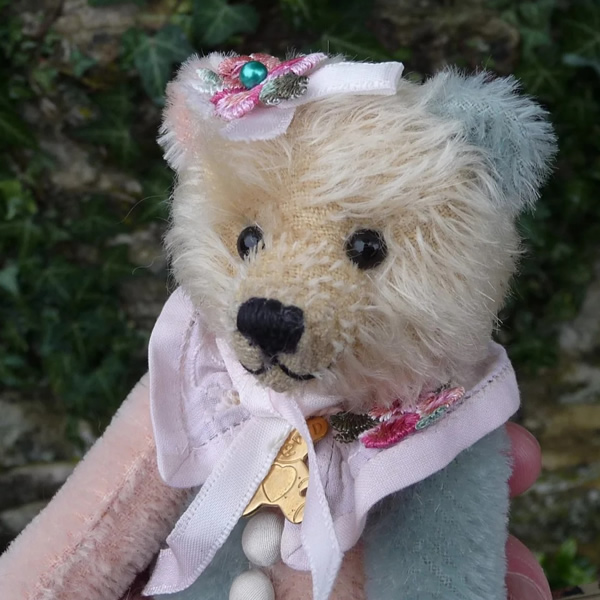 ボディに淡いピンクとブルーの毛足の短いモヘアを、頭にはクリーム色のモヘアを使用した、ハーレクインスタイルで作られています。
