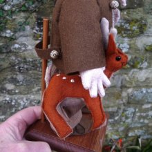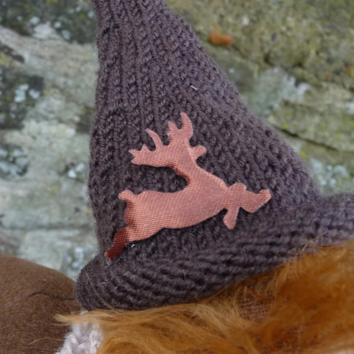 トナカイのアップリケ付きニット帽に、ニットのマフラー、コットンシャツ、レザーのサスペンダーで留められたコーデュロイのパンツ、フェルトジャケット、ストライプ柄のソックス、フェルト製ブーツを着用。