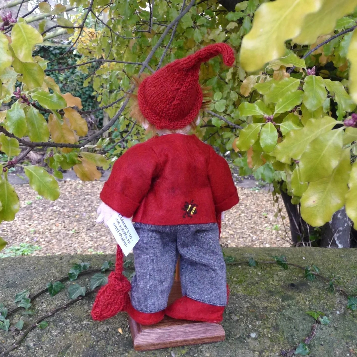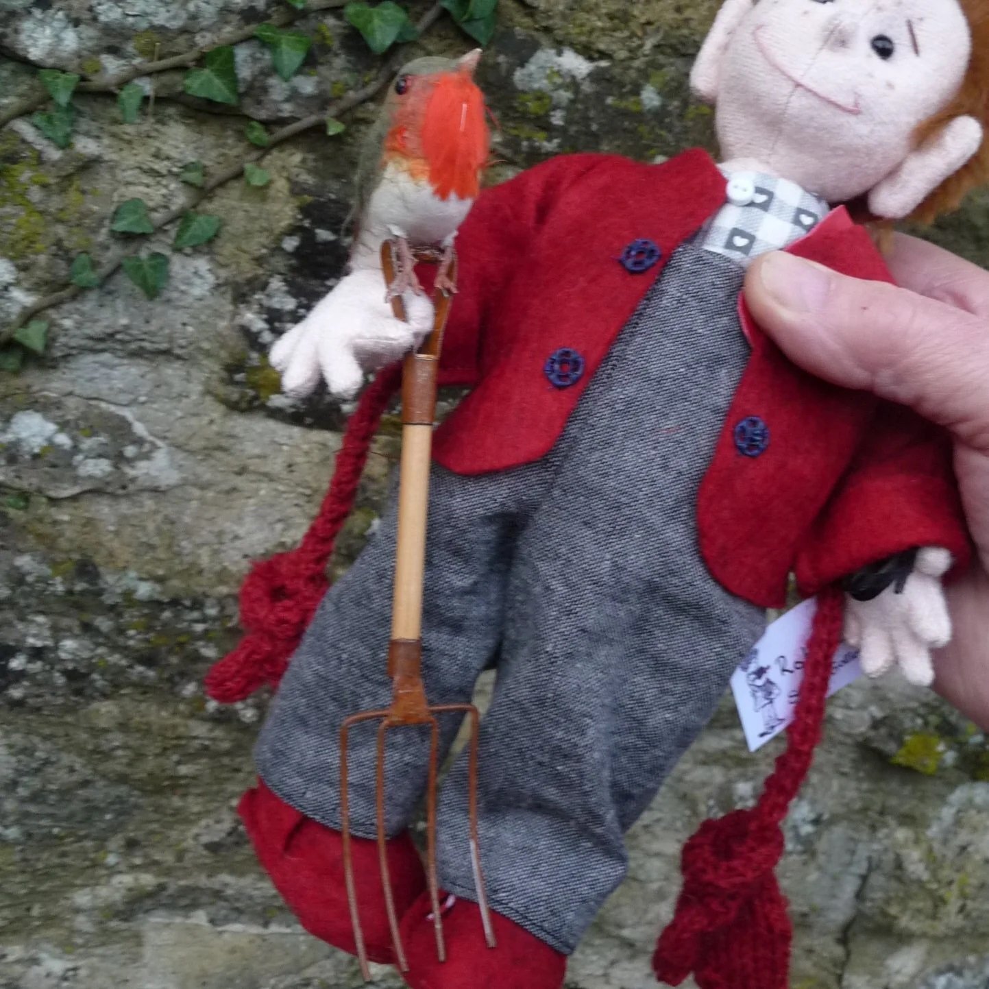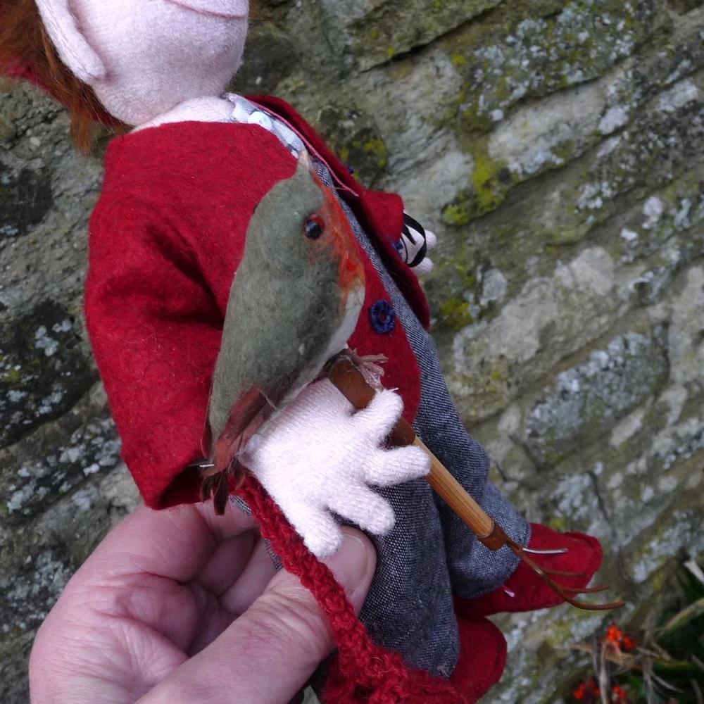 先端にコマドリがとまったガーデンフォークを持ち、両手首にはニットのミトンがぶら下がっています。
