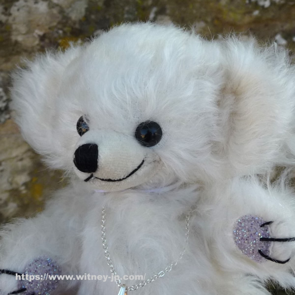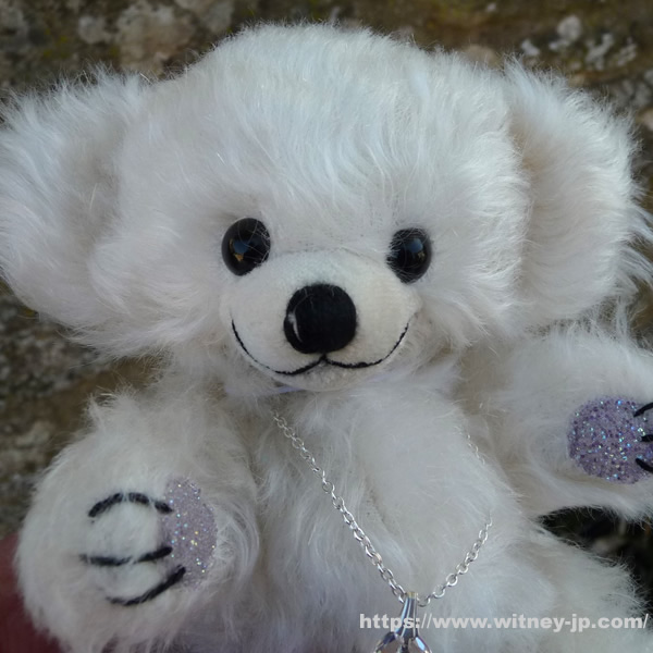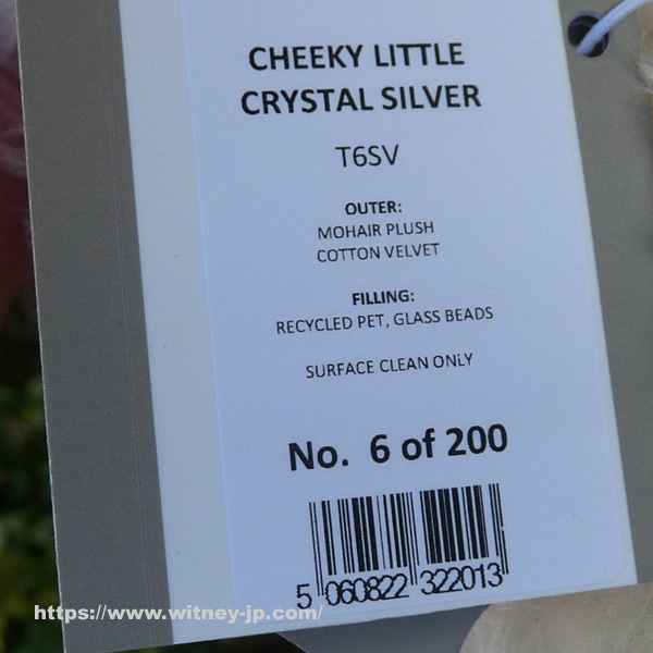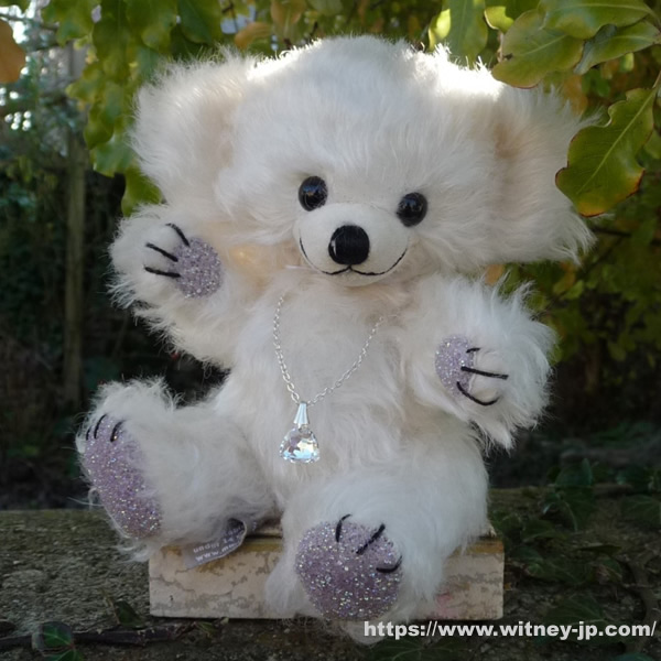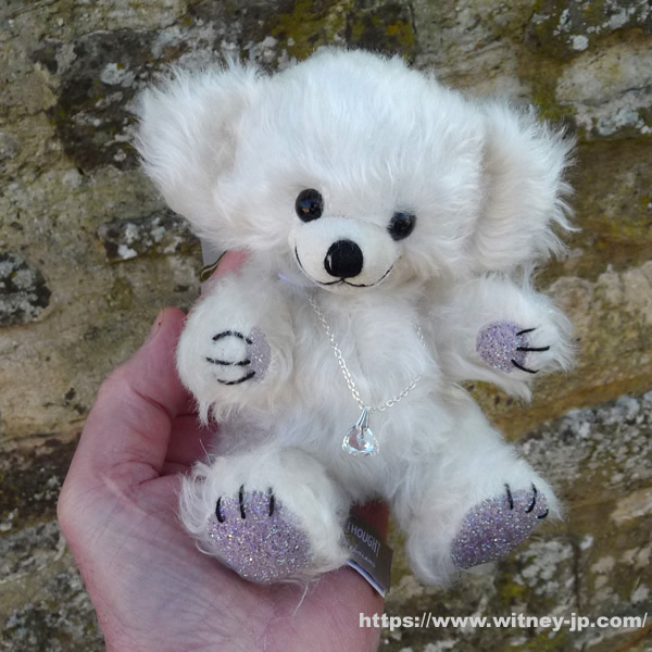 画像のシリアルナンバー6番をお届けします。優しくウエーブした、アイボリーカラーのモヘア製。フェルトの鼻づら。黒いプラスチックの目。手足の裏にはキラキラと光るクリスタル風の生地が使われています。シルバープレートのチェーンに、フェイククリスタルのペンダントをつけています。化繊綿とガラスビーズで柔らかく詰められています。2025年11月発売、メリーソート社製、世界限定200体。約15cm。証明書・メリーソートのロゴ入りきんちゃく袋付き。画像の商品をお届けします。 ※このテディベアはウィットニーでも販売しています。入違いで完売の場合にはご容赦ください。(確保できなかった場合には分かり次第ご注文者様にご連絡いたします。)