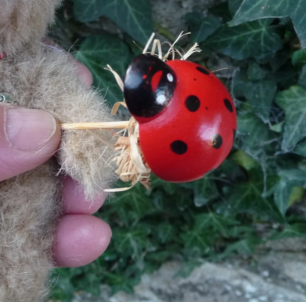 木製のてんとう虫が付いたスティックを持っています。
