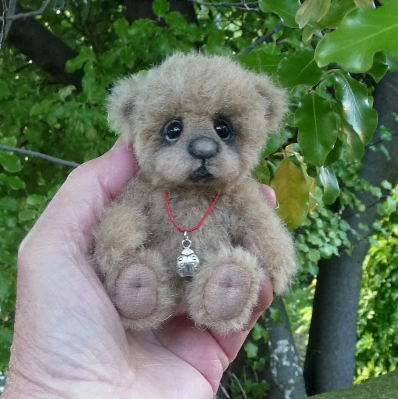 手のひらに収まるほどの小さな、愛らしいテディベア。