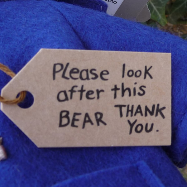 ‘Please look after this bear. Thank you.(このくまをよろしくお願いします。)’と書かれたタグ付きです。