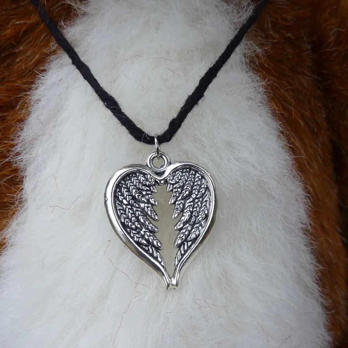 ハートのペンダントをつけています。
