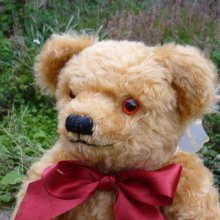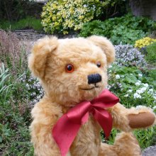 ウエーブしたゴールドモヘアと特徴的な栗色のフェルトの手足、手縫いの爪などを組み合わせてハンドメイドで作られています。