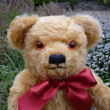 5ジョイントで、抱きあげて傾けると低いうなり声で鳴きます。当時と同じように首のリボンは、結び目をセンターから少しずらした位置につけています。