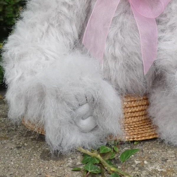 ベリー色の糸で手刺繍された鼻、軽くトリミングされ、エアブラシで色付けが施された鼻づら、爪が刺繍されたフェイクスエードの足の裏。